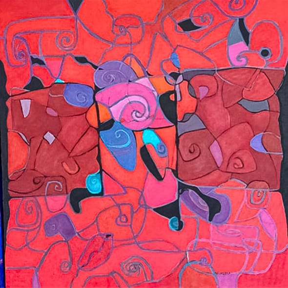 Esta pintura muestra la unión de dos almas gemelas que al caminar por la vida se encuentran y conviven paralelamente en su largo andar.