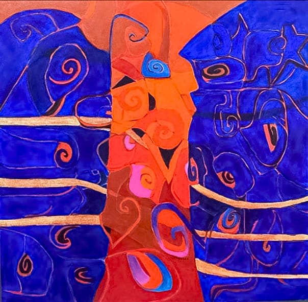 El ser central de esta pintura, semeja al árbol de la vida coronado con hilos dorados.