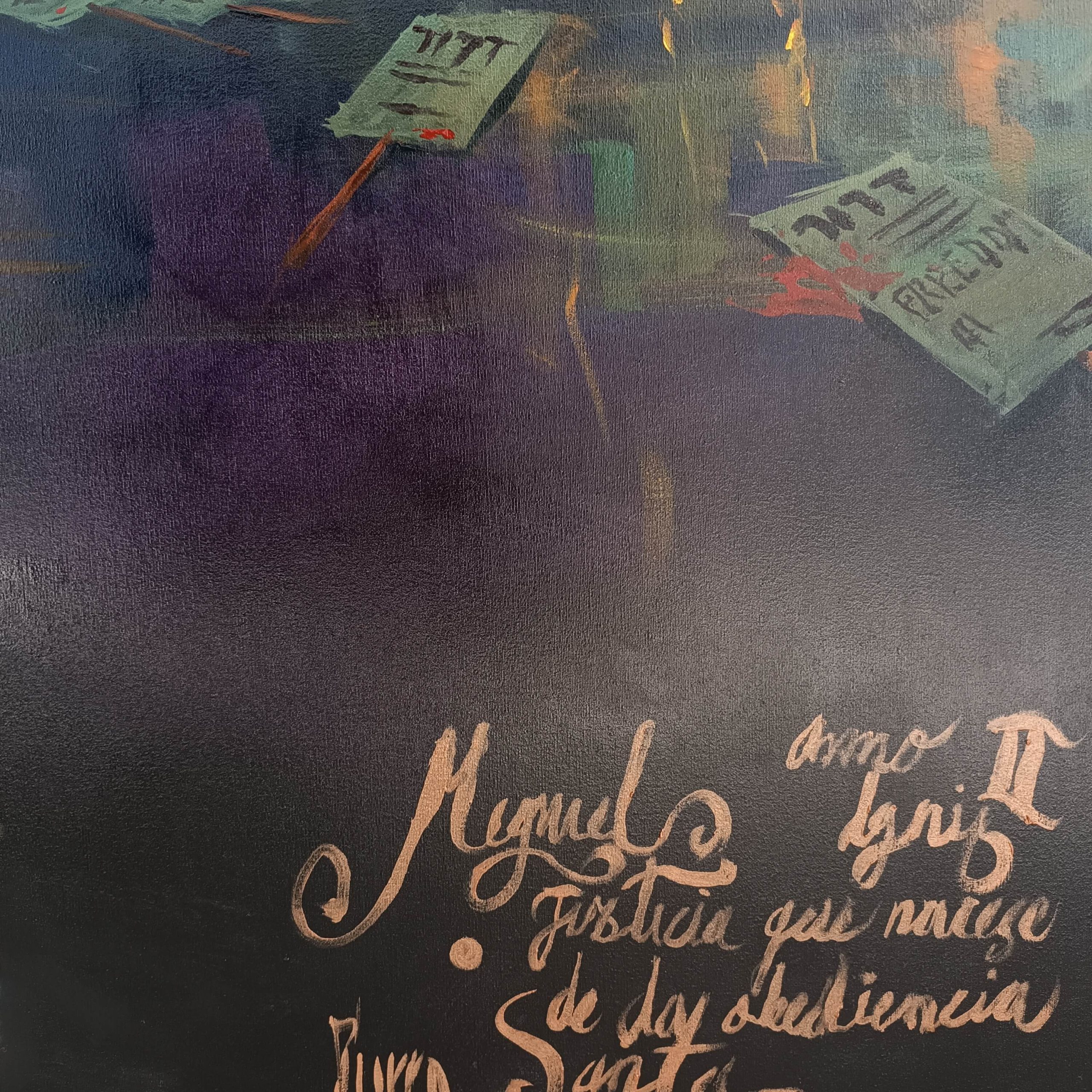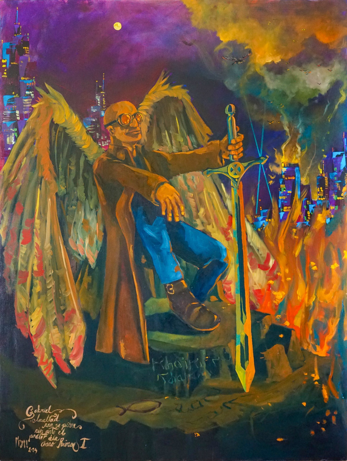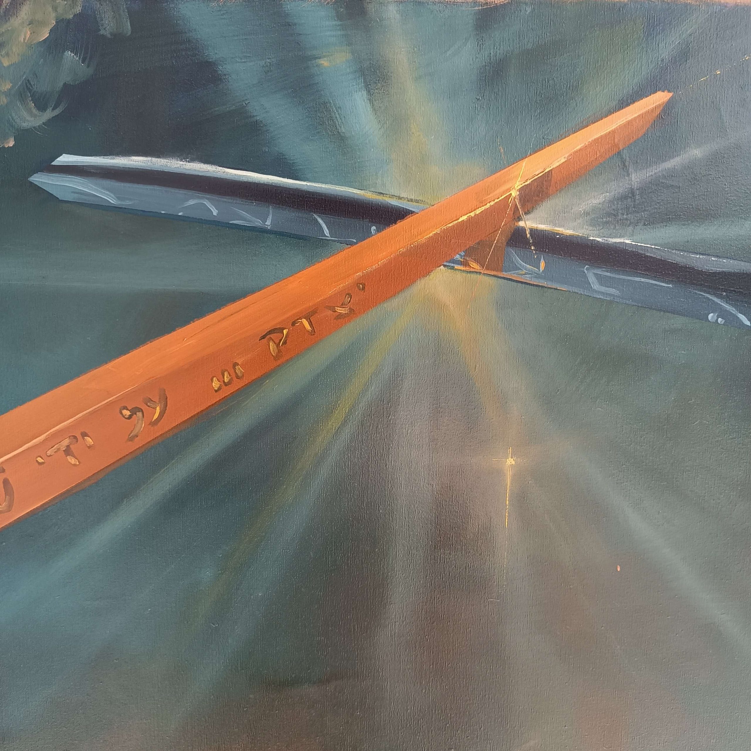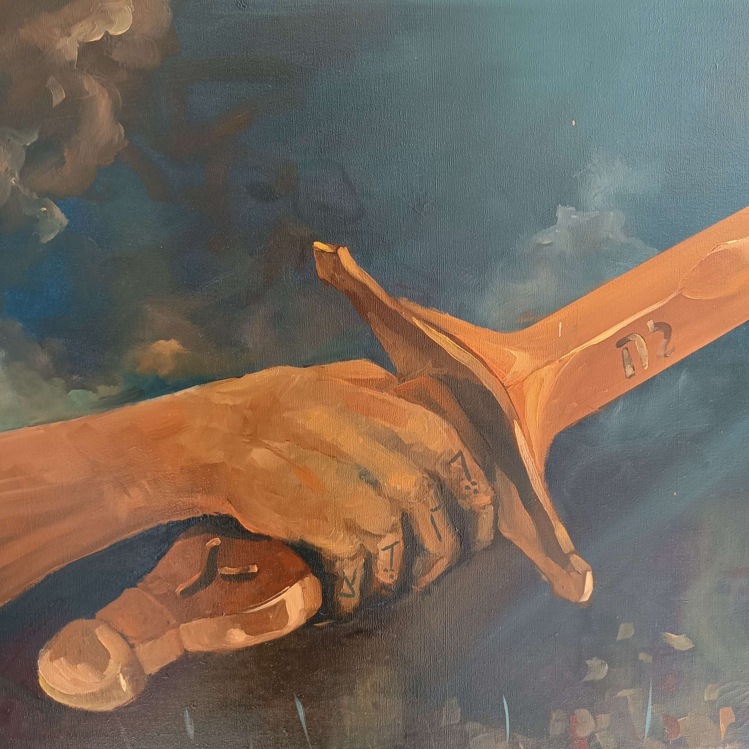 La obra integra inscripciones en hebreo y arameo como vestigios de una verdad antigua: palabras grabadas no como ornamento, sino como huellas de un pensamiento que antecede a la fe institucional. El símbolo del pez, las ruinas y las marcas corporales funcionan como rastros de una civilización espiritual en colapso.