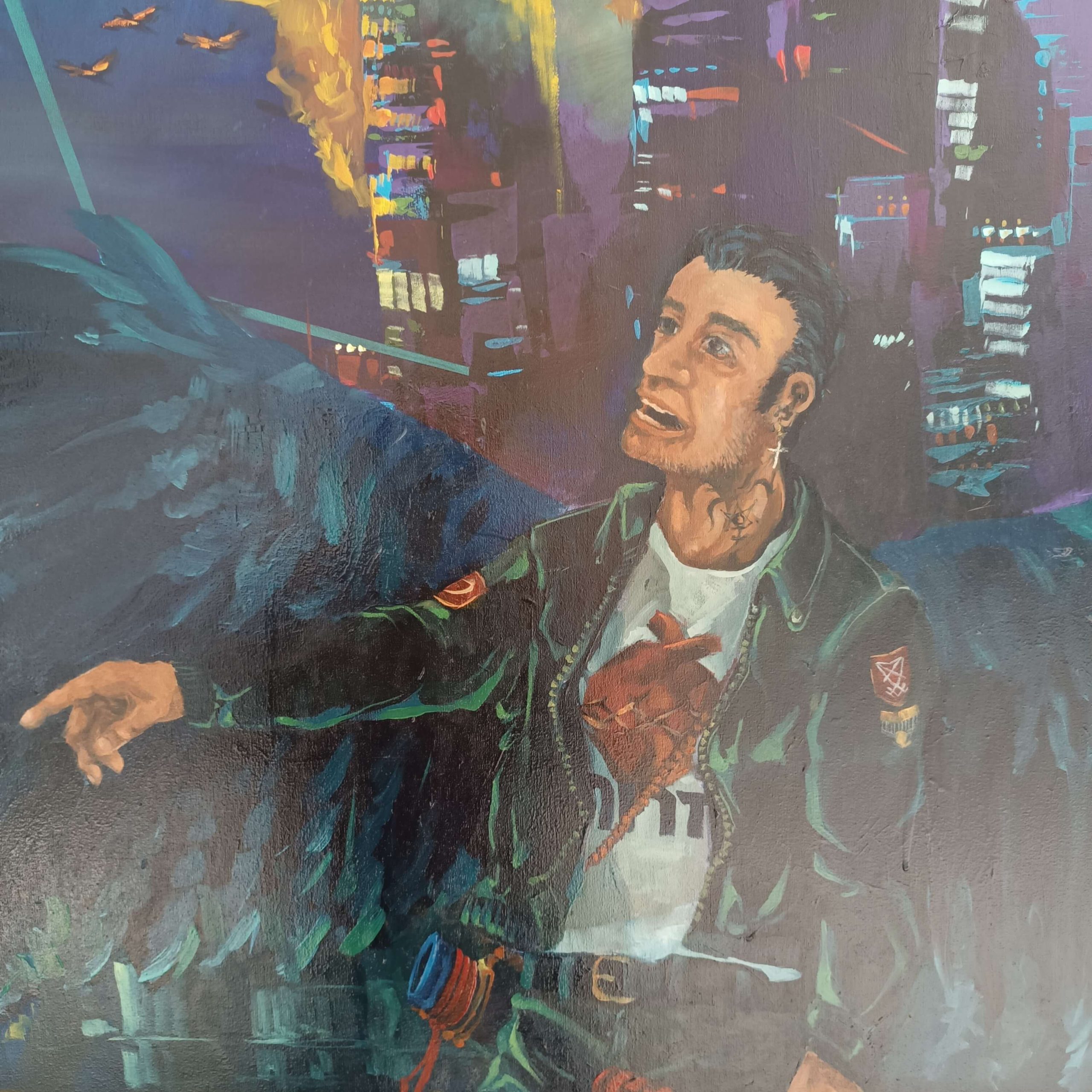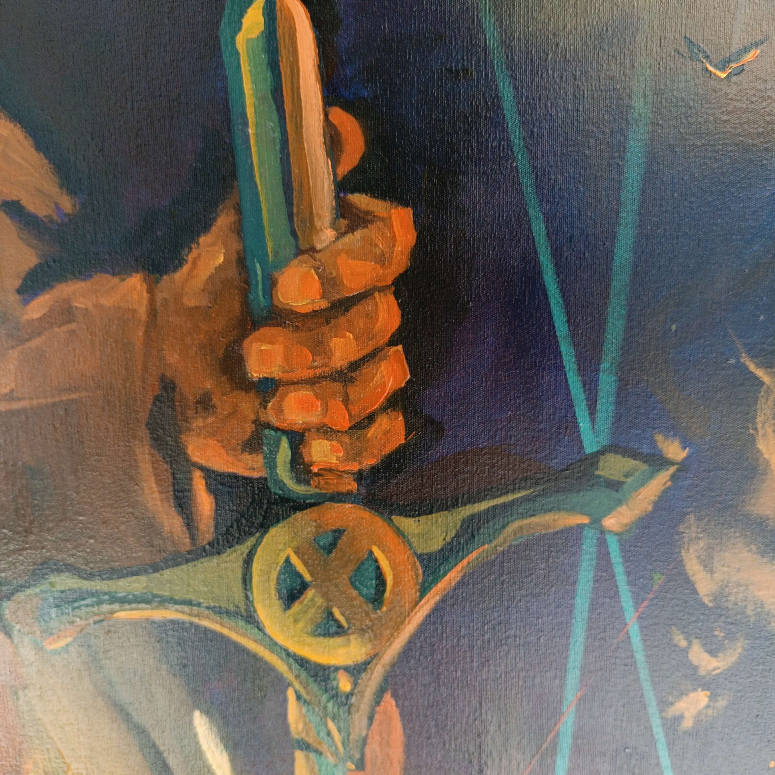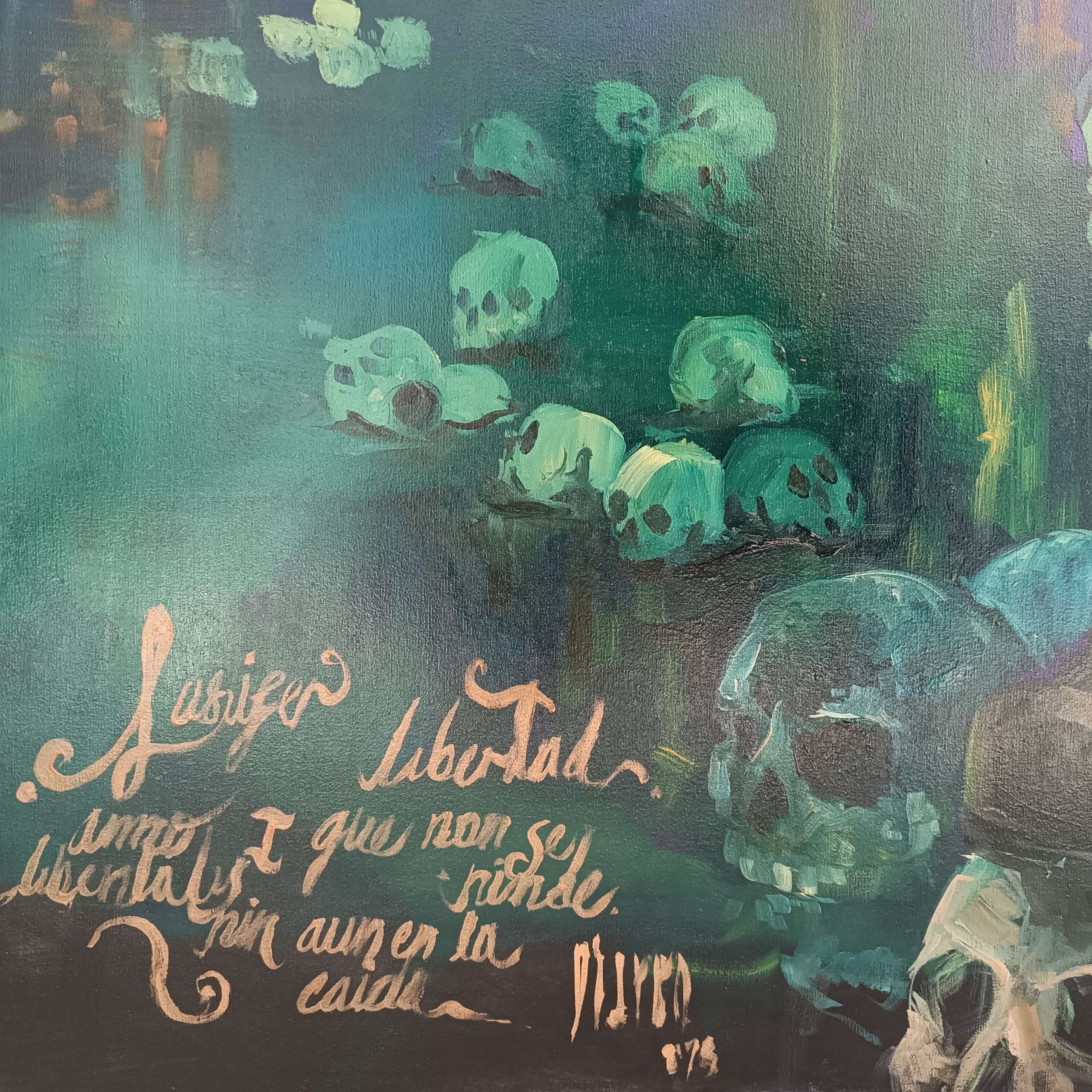 La obra integra inscripciones en hebreo y arameo como vestigios de una verdad antigua: palabras grabadas no como ornamento, sino como huellas de un pensamiento que antecede a la fe institucional. El símbolo del pez, las ruinas y las marcas corporales funcionan como rastros de una civilización espiritual en colapso.